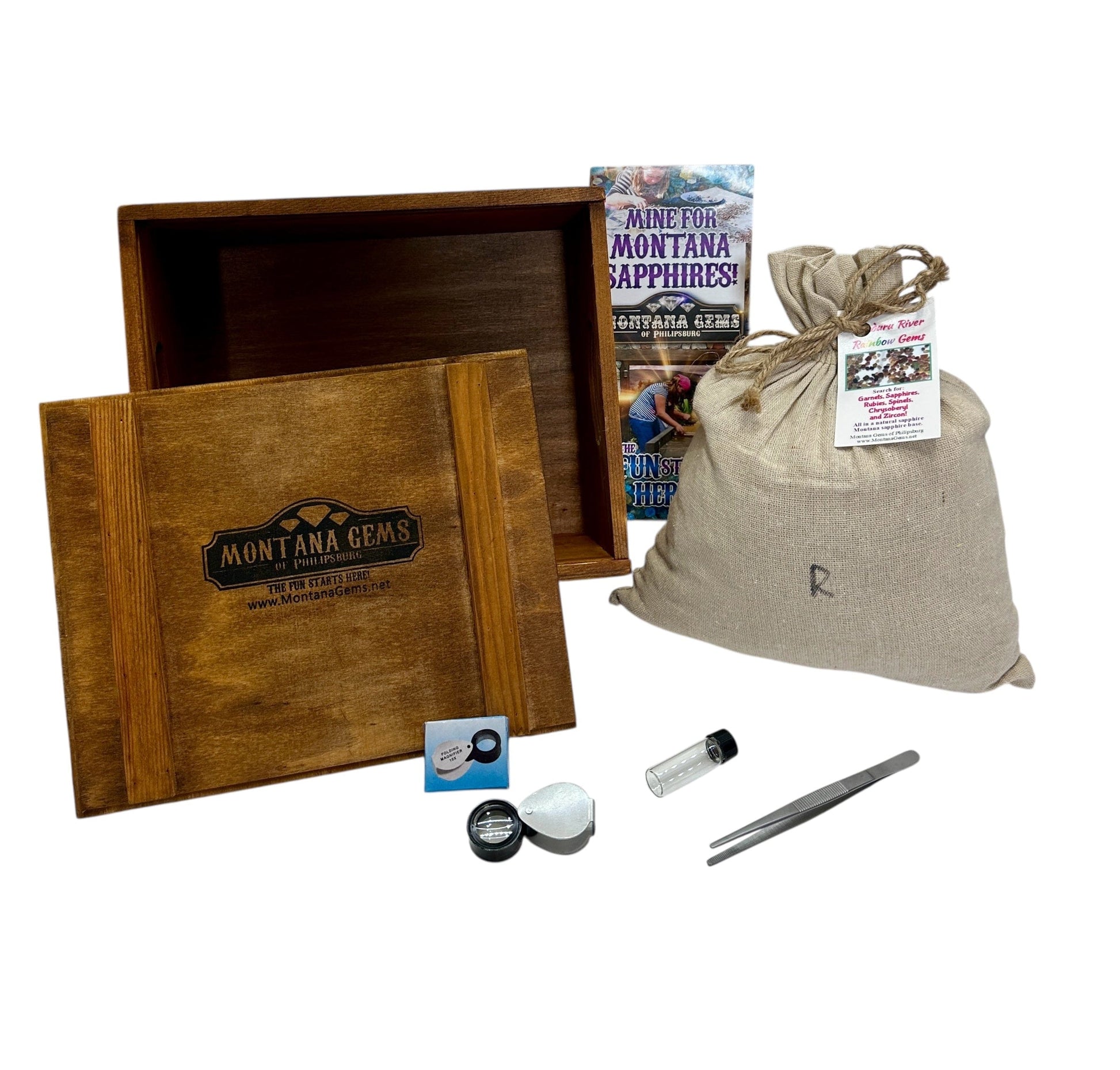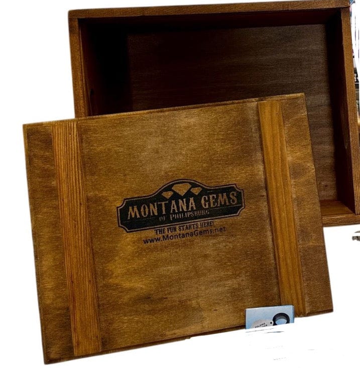 The box is made of natural wood with metal hinges. We offer both sliding top or rope handle versions - please let us know in comments if you have a preference. The sapphire gravel comes in a burlap sack that is also reusable. Mining instructions and photo are included to help walk you through the mining process.
